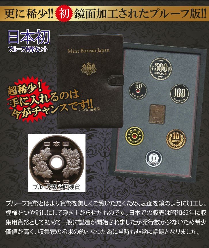 内容 | ブルーフ貨幣とはより貨幣を美しくご覧いただくため、表面を鏡のように加工し、模様をつや消しにして浮き上がらせたものです。日本での販売は昭和62年に収集用貨幣として初めて一般に製造が開始されましたが発行数が少ないため希少価値が高く、収集家の希求の的となった為に当時も非常に話題となりました。 |