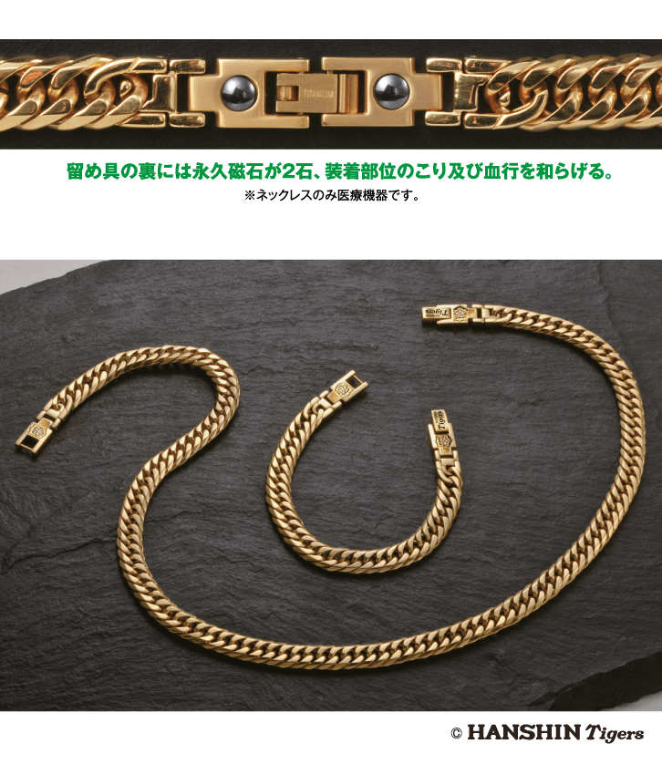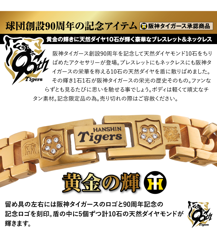 球団創設90周年の記念アイテム 阪神タイガース承認商品 黄金の輝きに天然ダイヤ10石が輝く豪華なブレスレット&ネックレス 阪神タイガース創設90周年を記念して天然ダイヤモンド10石をちりばめたアクセサリーが登場。 ブレスレットにもネックレスにも阪神タイガースの栄華を称える10石の天然ダイヤを盾に散りばめました。 その輝き1石1石が阪神タイガースの栄光の歴史そのもの。ファンならずとも見るたびに思いを馳せる事でしょう。 ボディは軽くて頑丈なチタン素材。 記念限定品の為 売り切れの際はご容赦ください。 留め具の左右には阪神タイガースのロゴと90周年記念の記念ロゴを刻印。 盾の中に5個ずつ計10石の天然ダイヤモンドが輝きます。 留め具の裏には永久磁石が2石、装着部位のこり及び血行を和らげる。 ※ネックレスのみ医療機器です。 |