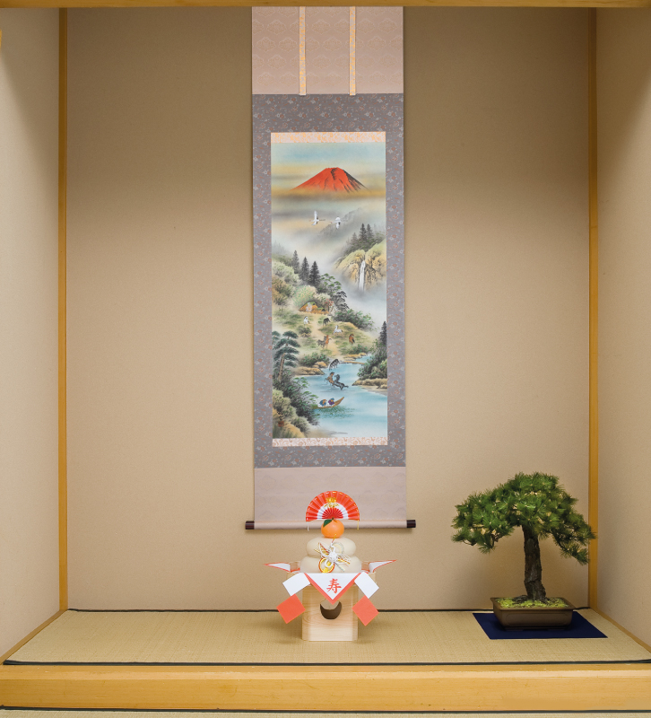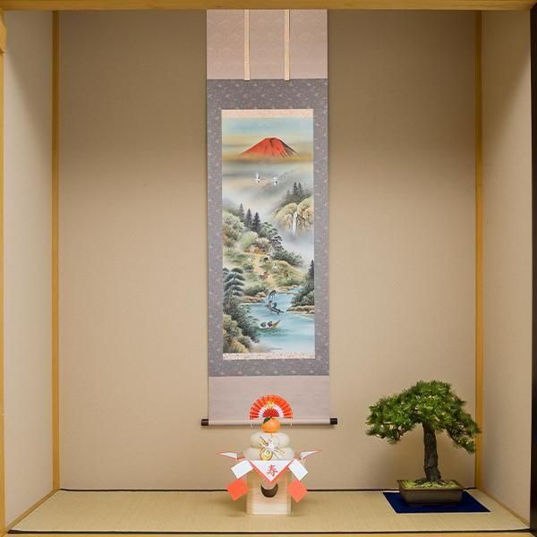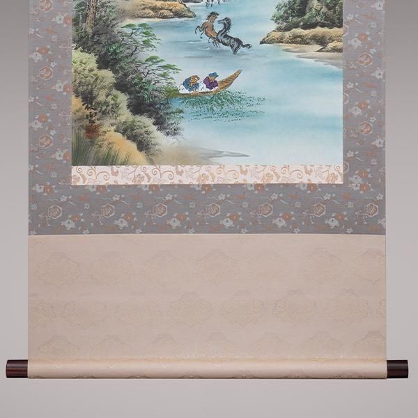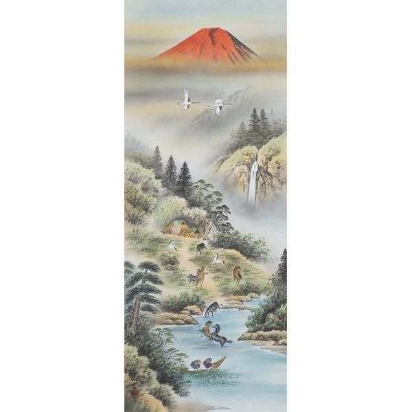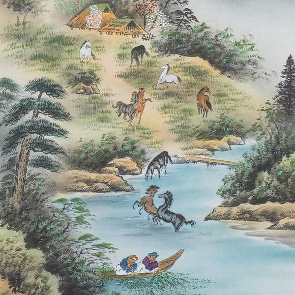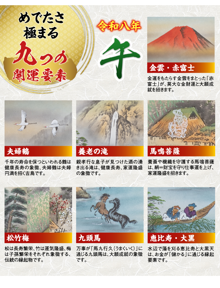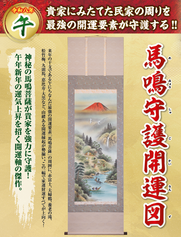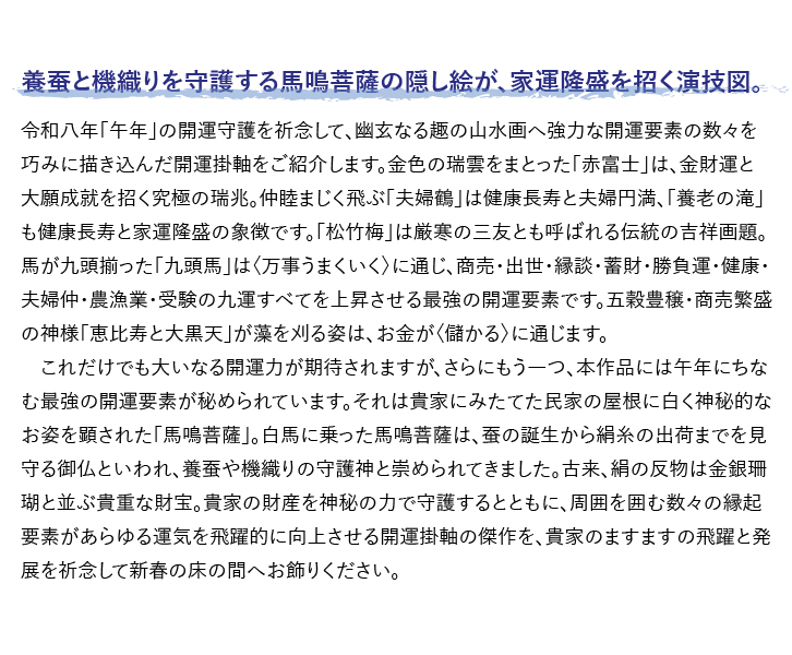 貴家にみたてた民家の周りを最強の開運要素が守護する!! 神秘の馬鳴菩薩が貴家を強力に守護!午年新年の運気上昇を招く開運軸の傑作。 来年の干支である午にちなんだ最強の開運要素「馬鳴菩薩」の周囲に、赤富士、夫婦鶴、養老の滝、松竹梅、九頭馬、恵比寿・大黒など、由緒ある開運縁起が勢揃い。 この一幅で家運財運すべてが上向く! 養蚕と機織りを守護する馬鳴菩薩の隠し絵が、家運隆盛を招く演技図。 令和八年「午年」の開運守護を祈念して、幽玄なる趣の山水画へ強力な開運要素の数々を巧みに描き込んだ開運掛軸をご紹介します。 金色の瑞雲をまとった「赤富士」は、金財運と大願成就を招く究極の瑞兆。 仲睦まじく飛ぶ「夫婦鶴」は健康長寿と夫婦円満、「養老の滝」も健康長寿と家運隆盛の象徴です。 「松竹梅」は厳寒の三友とも呼ばれる伝統の吉祥画題。馬が九頭揃った「九頭馬」は〈万事うまくいく〉に通じ、商売・出世・縁談・蓄財・勝負運・健康・夫婦仲・農漁業・受験の九運すべてを上昇させる最強の開運要素です。五穀豊穣・商売繁盛の神様「恵比寿と大黒天」が藻を刈る姿は、お金が〈儲かる〉に通じます。 これだけでも大いなる開運力が期待されますが、さらにもう一つ、本作品には午年にちなむ最強の開運要素が秘められています。 それは貴家にみたてた民家の屋根に白く神秘的なお姿を顕された「馬鳴菩薩」。 白馬に乗った馬鳴菩薩は、蚕の誕生から絹糸の出荷までを見守る御仏といわれ、養蚕や機織りの守護神と崇められてきました。 古来、絹の反物は金銀珊瑚と並ぶ貴重な財宝。貴家の財産を神秘の力で守護するとともに、周囲を囲む数々の縁起要素があらゆる運気を飛躍的に向上させる開運掛軸の傑作を、貴家のますますの飛躍と発展を祈念して新春の床の間へお飾りください。 めでたさ極まる九つの開運要素 金雲・赤富士:金運をもたらす金雲をまとった「赤富士」が、莫大な金財運と大願成就を招きます。 夫婦鶴:千年の寿命を保つといわれる鶴は健康長寿の象徴、夫婦鶴は夫婦円満を招く吉鳥です。 養老の滝:親孝行な息子が見つけた酒の湧き出る滝は、健康長寿、家運隆盛の象徴です。 松竹梅:松は長寿繁栄、竹は運気隆盛、梅は子孫繁栄をそれぞれ象徴する、伝統の縁起物です。 九頭馬:万事が「馬九行久(うまくいく)」に通じる九頭馬は、大願成就の象徴です。 恵比寿・大黒:水辺で藻を刈る恵比寿と大黒天は、お金が「儲かる」に通じる縁起要素です。 馬鳴菩薩:養蚕や機織を守護する馬鳴菩薩は、絹=財宝を守り仕事運を上げ、家運隆盛を招きます。 |