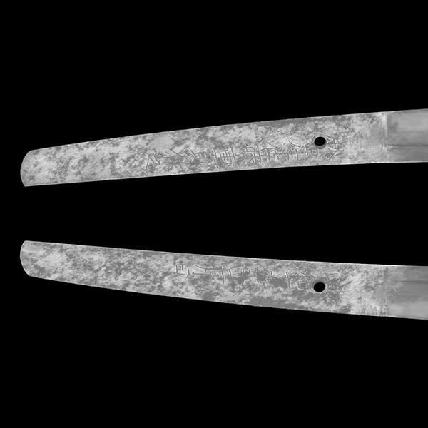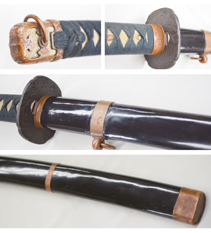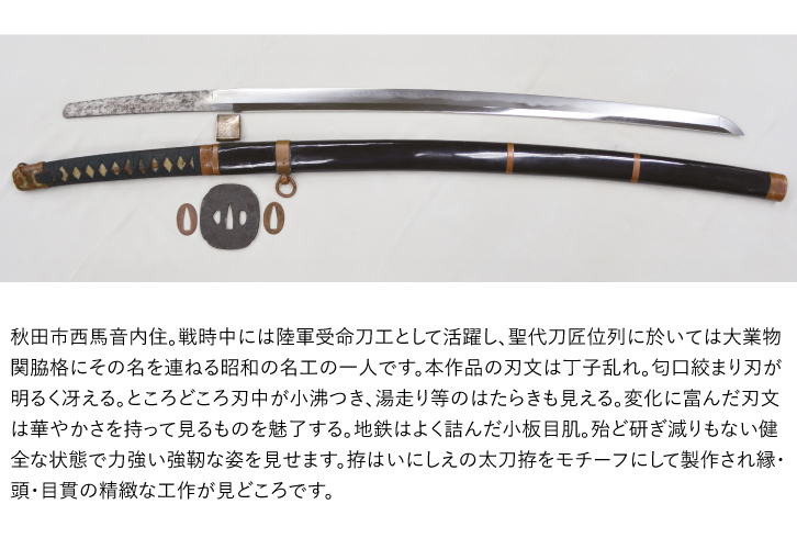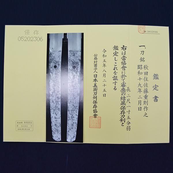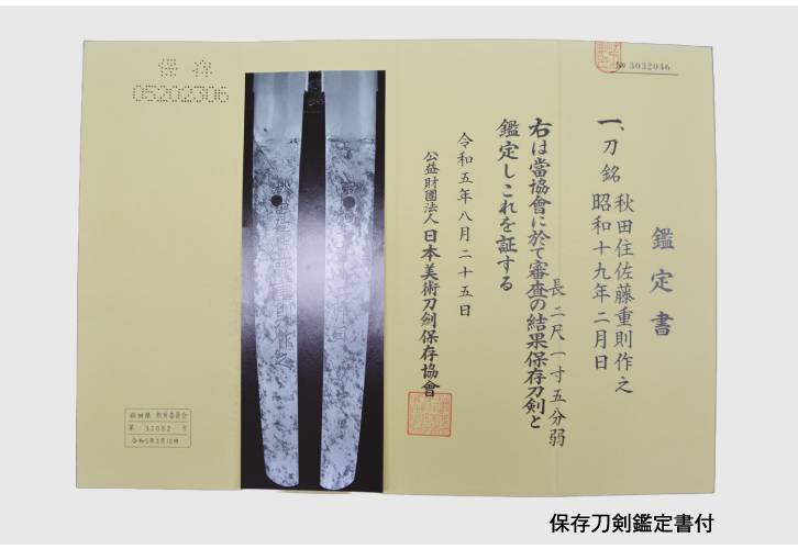 ● 銘文/(表)秋田住佐藤重則作之(裏)昭和十九年二月日 ● 刃長/二尺一寸五分(65.1cm) 反り/四分(1.2cm) ● 刃文/丁子乱れ ● 昭和初期 ● 保存刀剣鑑定書付 |