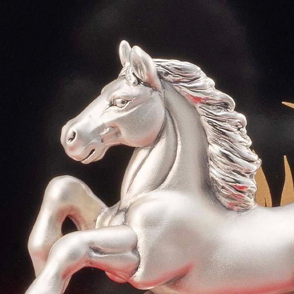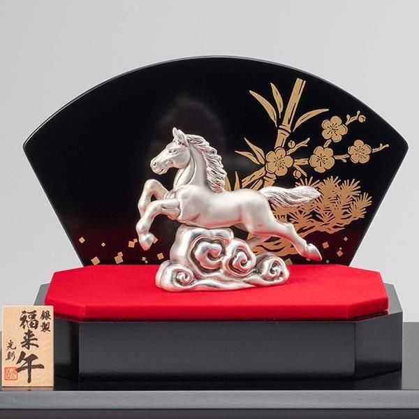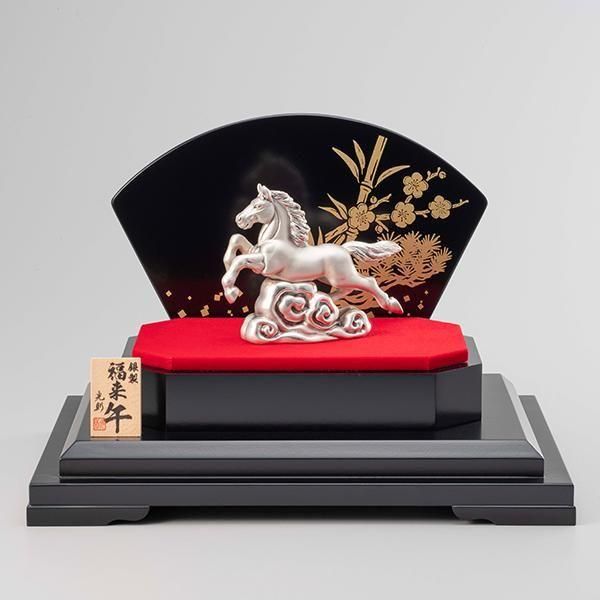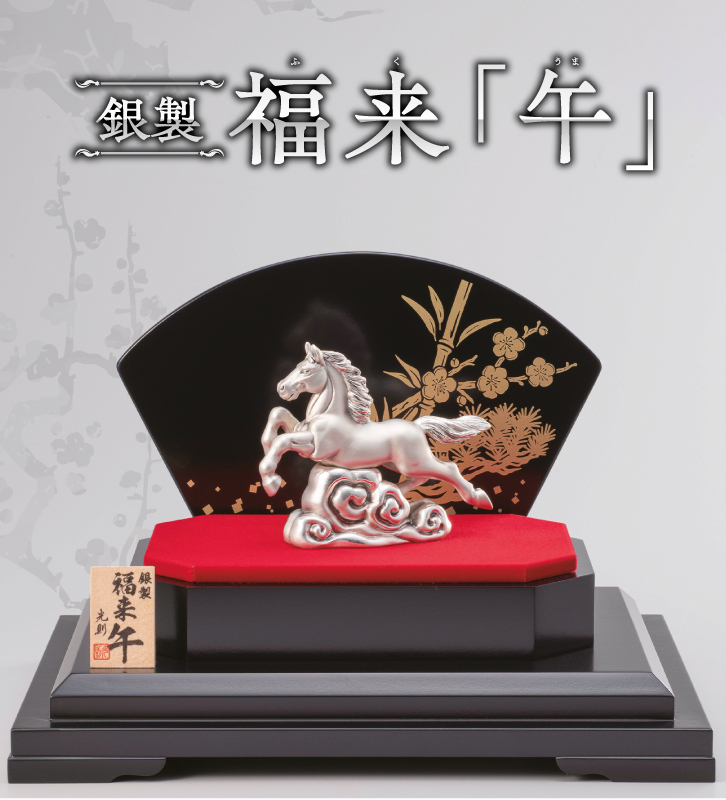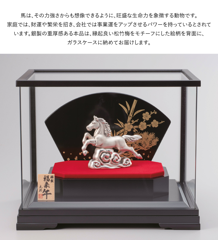 銀製福来「午」 馬は、その力強さからも想像できるように、旺盛な生命力を象徴する動物です。 家庭では、財運や繁栄を招き、会社では事業運をアップさせるパワーを持っているとされています。 銀製の重厚感ある本品は、縁起良い松竹梅をモチーフにした絵柄を背面に、ガラスケースに納めてお届けします。 |