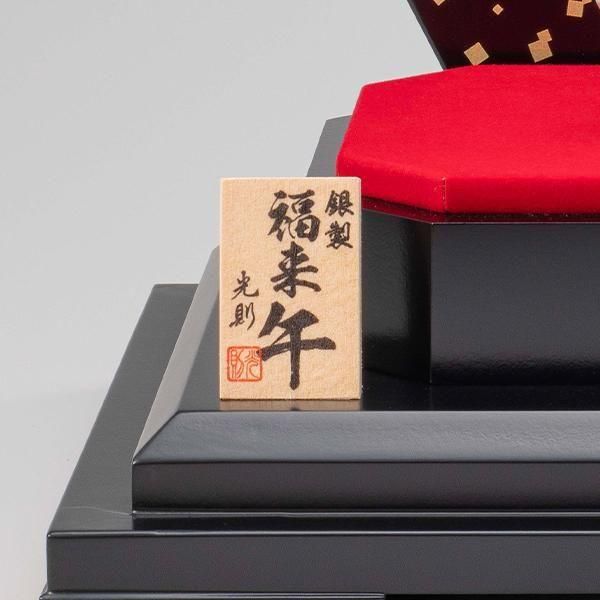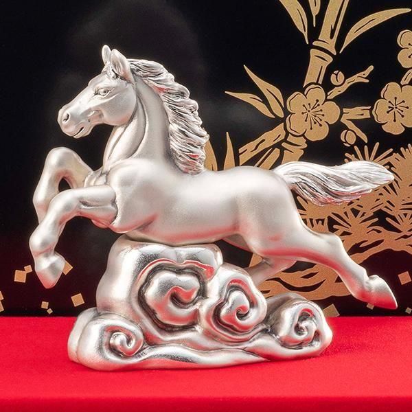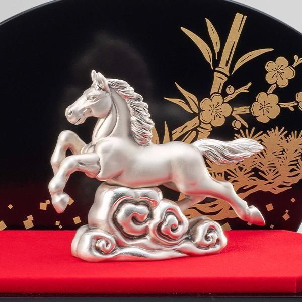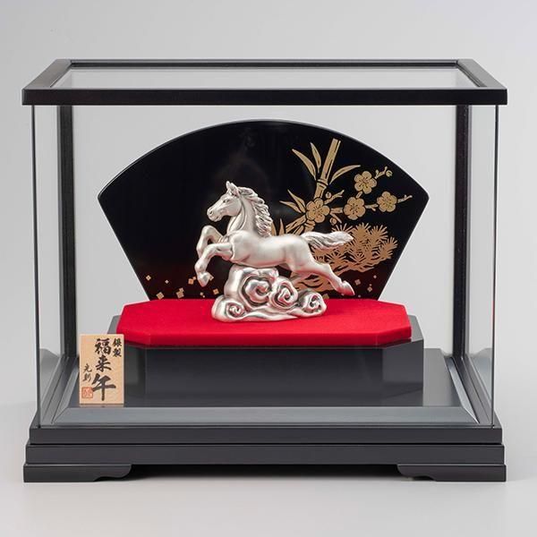 銀製福来「午」 馬は、その力強さからも想像できるように、旺盛な生命力を象徴する動物です。 家庭では、財運や繁栄を招き、会社では事業運をアップさせるパワーを持っているとされています。 銀製の重厚感ある本品は、縁起良い松竹梅をモチーフにした絵柄を背面に、ガラスケースに納めてお届けします。 |