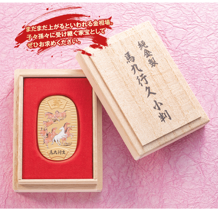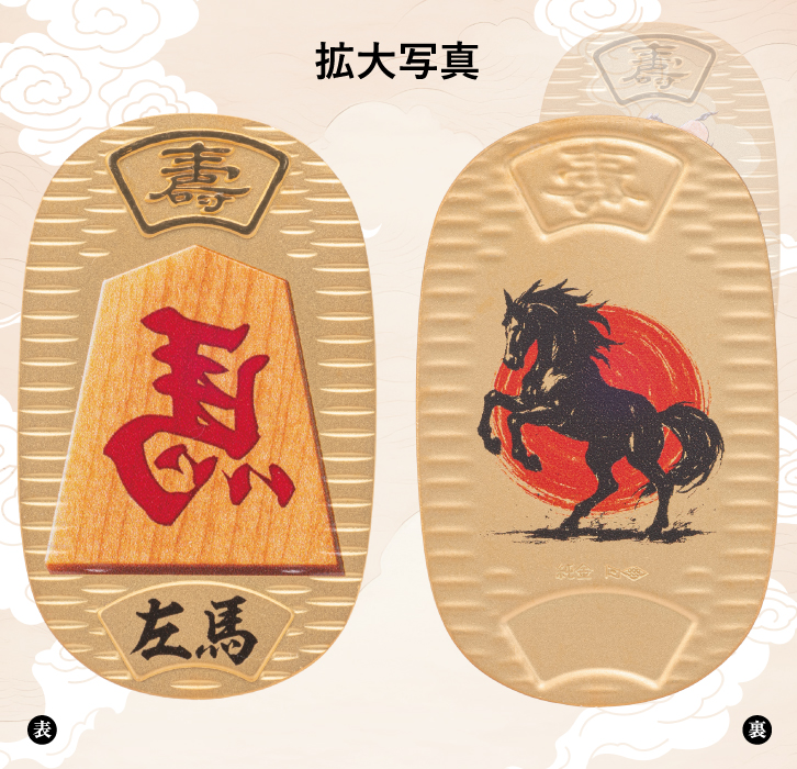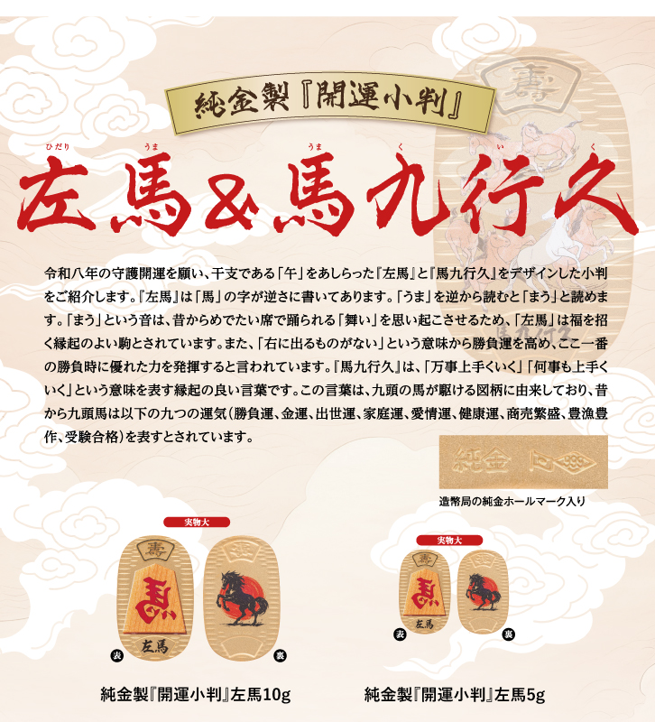 純金製 開運小判 左馬&馬九行久 令和八年の守護開運を願い、干支である「午」をあしらった『左馬』と『馬九行久』をデザインした小判をご紹介します。 『左馬』は「馬」の字が逆さに書いてあります。「うま」を逆から読むと「まう」と読めます。 「まう」という音は、昔からめでたい席で踊られる「舞い」を思い起こさせるため、「左馬」は福を招く縁起のよい駒とされています。 また、「右に出るものがない」という意味から勝負運を高め、ここ一番の勝負時に優れた力を発揮すると言われています。 『馬九行久』は、「万事上手くいく」「何事も上手くいく」という意味を表す縁起の良い言葉です。 この言葉は、九頭の馬が駆ける図柄に由来しており、昔から九頭馬は以下の九つの運気(勝負運、金運、出世運、家庭運、愛情運、健康運、商売繁盛、豊漁豊作、受験合格)を表すとされています。 造幣局の純金ホールマーク入り |