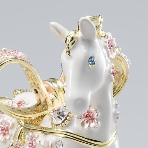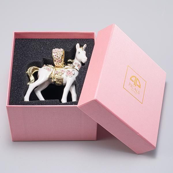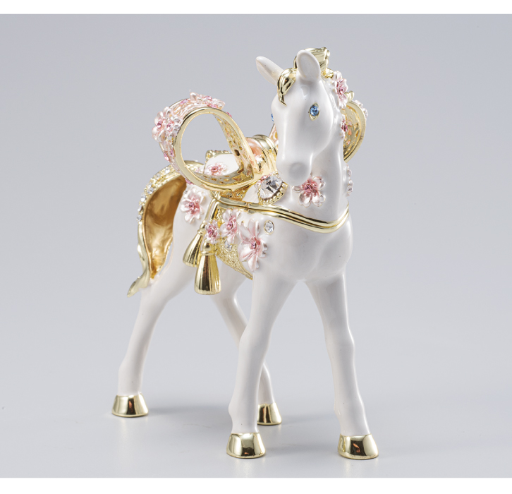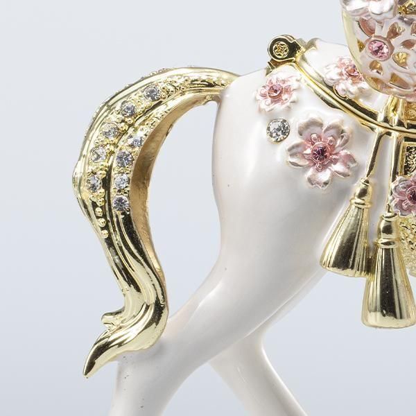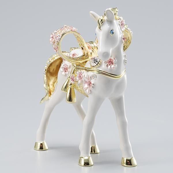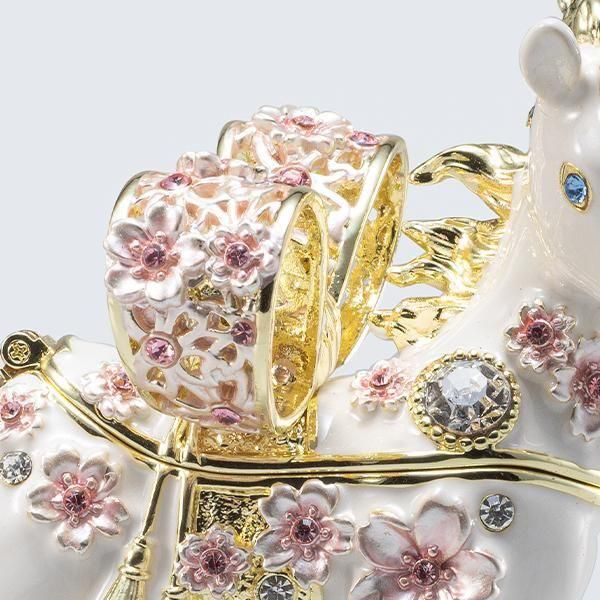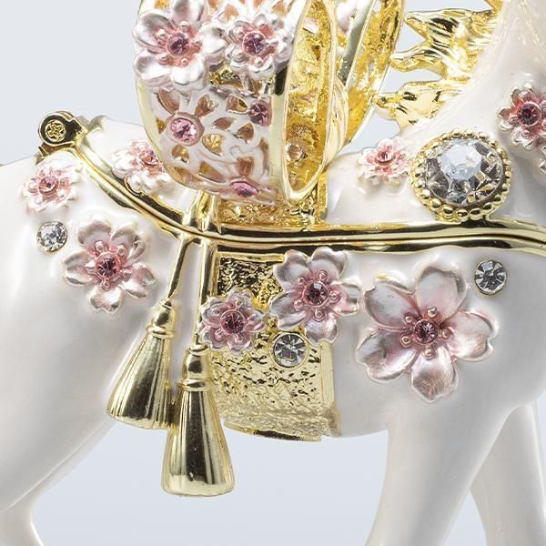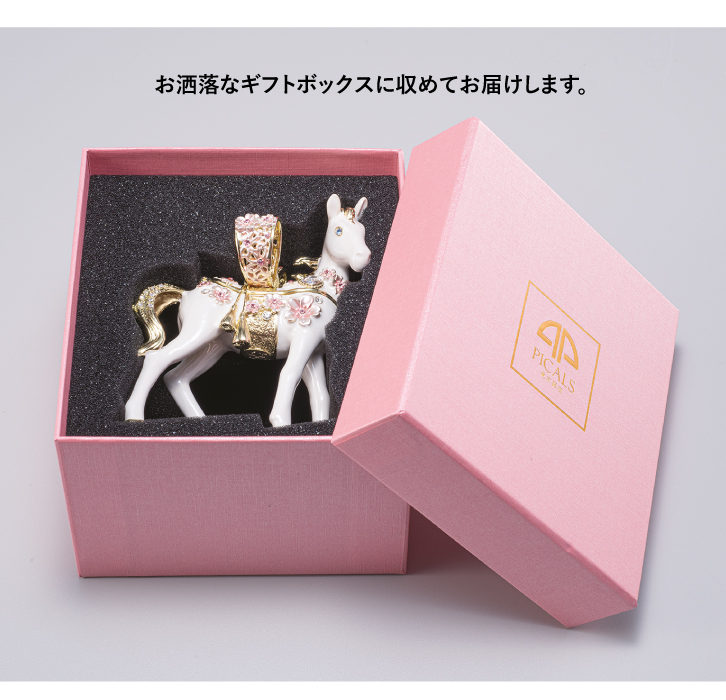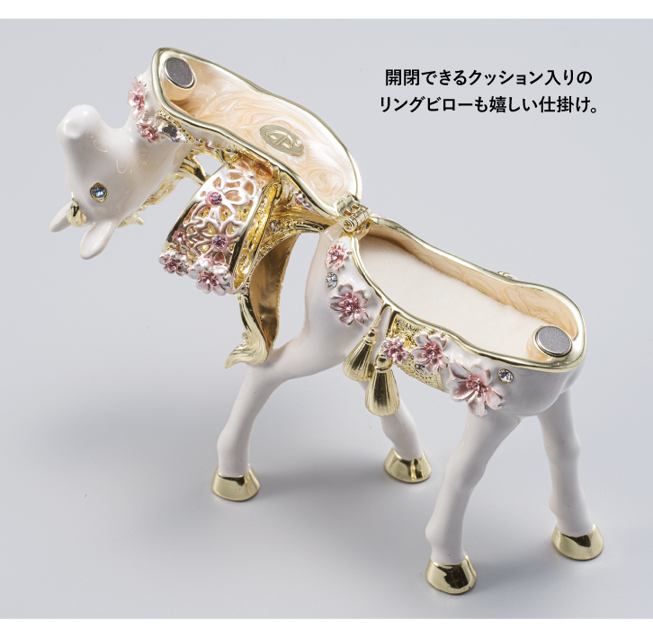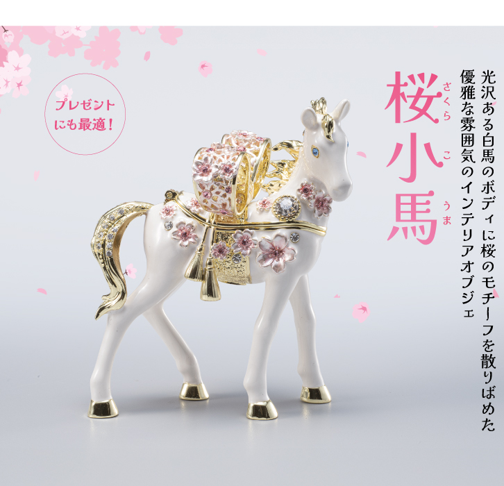 光沢ある白馬のボディに桜のモチーフを散りばめた 優雅な雰囲気のインテリアオブジェ 桜小馬 プレゼントにも最適! 開閉できるクッション入りのリングビローも嬉しい仕掛け。 お洒落なギフトボックスに収めてお届けします。 |