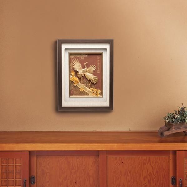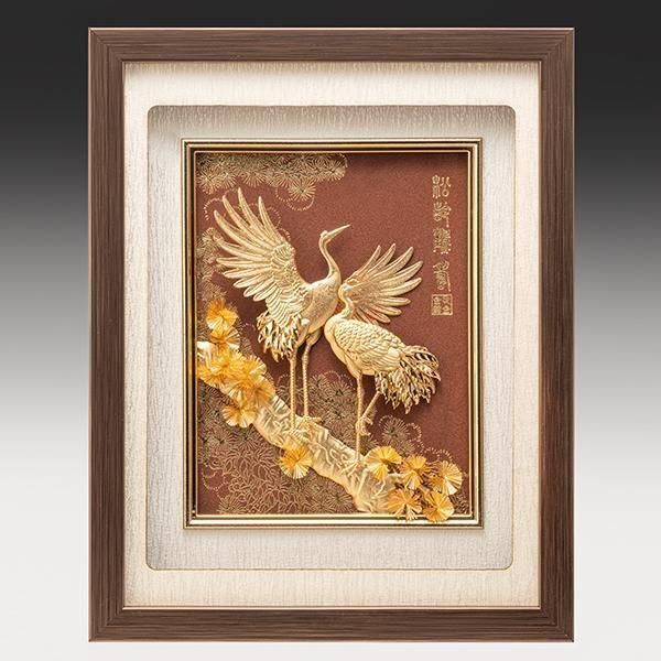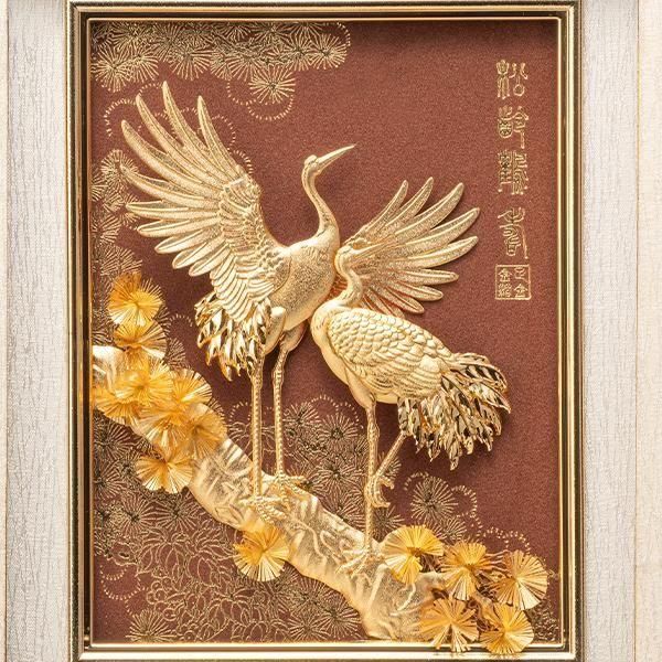 生涯の健康長寿を願う黄金の松鶴図黄金の輝きを放つ鶴と松の枝に純金箔を惜しげもなく使用した吉祥額の名品です。