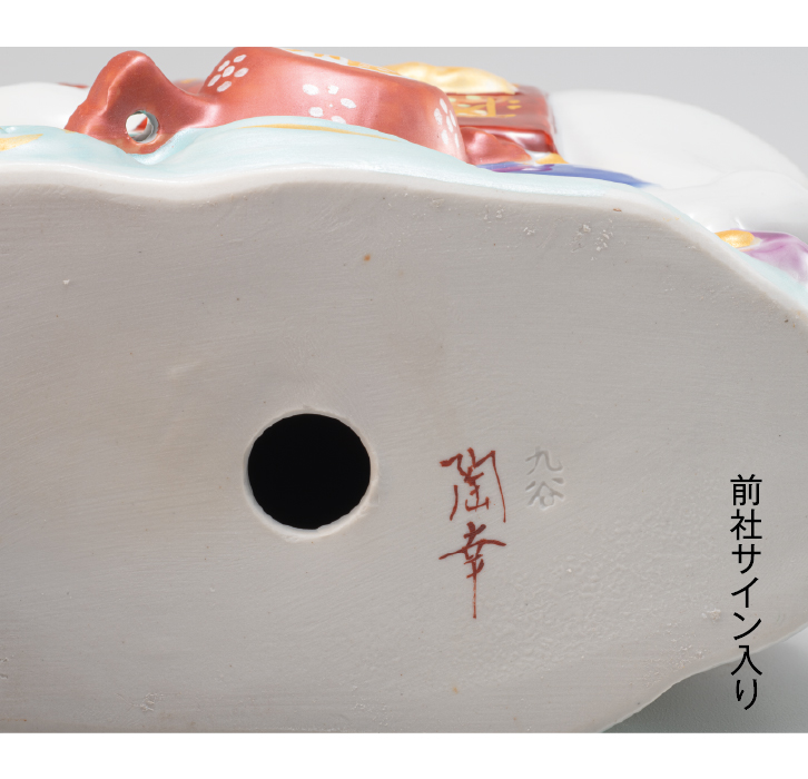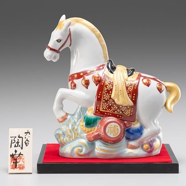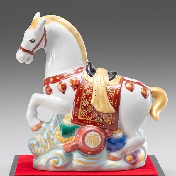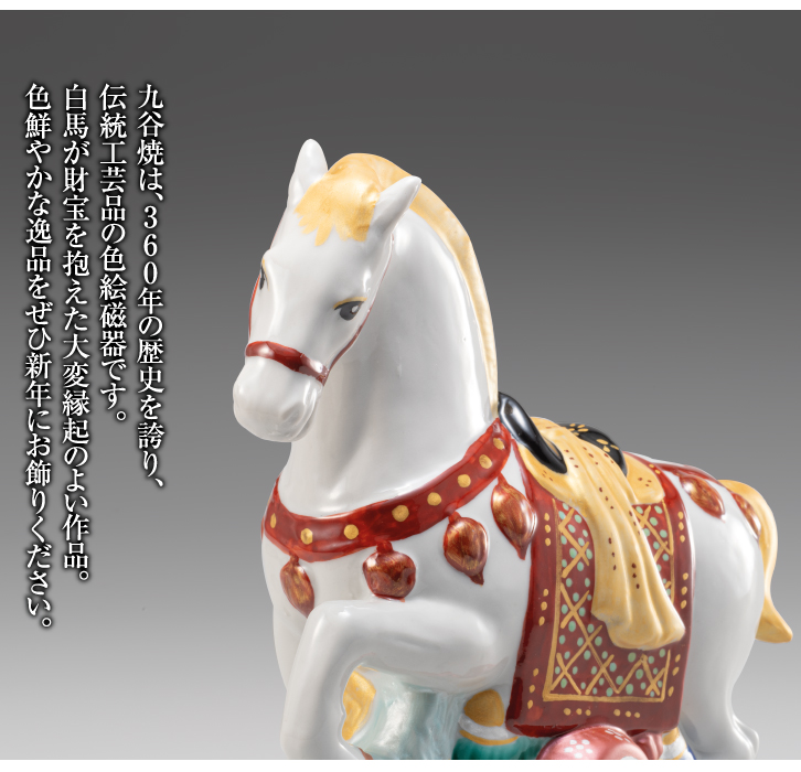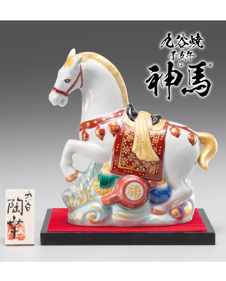 九谷焼干支午神馬 九谷焼は、360年の歴史を誇り、伝統工芸品の色絵磁器です。 白馬が財宝を抱えた大変縁起のよい作品。 色鮮やかな逸品をぜひ新年にお飾りください。 前社サイン入り |