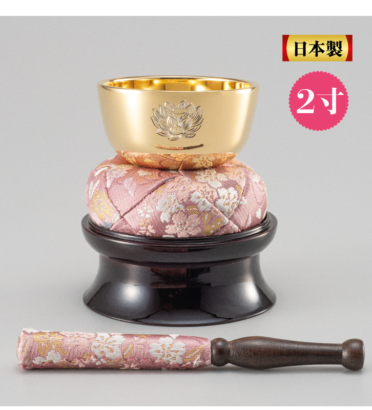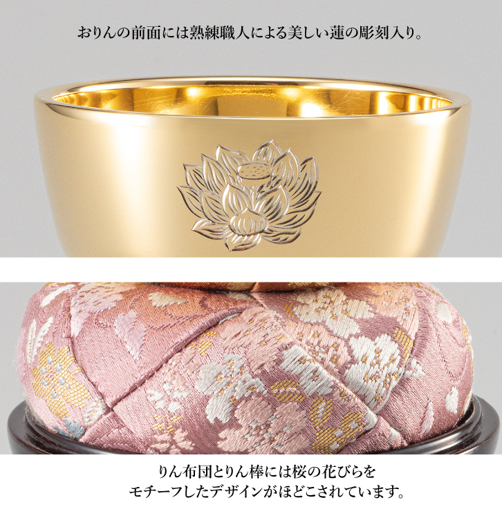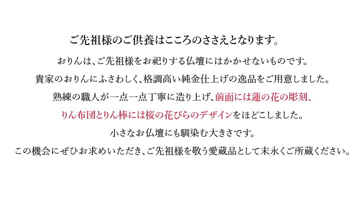 清く澄みわたる音色。 華やかに煌めく黄金の輝き。 小さなお仏壇にも映える逸品 純金仕上げ 蓮の花彫刻入り 日本製 ご先祖様のご供養はこころのささえとなります。 おりんは、ご先祖様をお祀りする仏壇にはかかせないものです。 貴家のおりんにふさわしく、格調高い純金仕上げの逸品をご用意しました。熟練の職人が一点一点丁寧に造り上げ、前面には蓮の花の彫刻、りん布団とりん棒には桜の花びらのデザインをほどこしました。小さなお仏壇にも馴染む大きさです。この機会にぜひお求めいただき、ご先祖様を敬う愛蔵品として末永くご所蔵ください。 底面には24K「Gold Plated」の刻印入り おりんの前面には熟練職人による美しい蓮の彫刻入り。 りん布団とりん棒には桜の花びらをモチーフしたデザインがほどこされています。 |