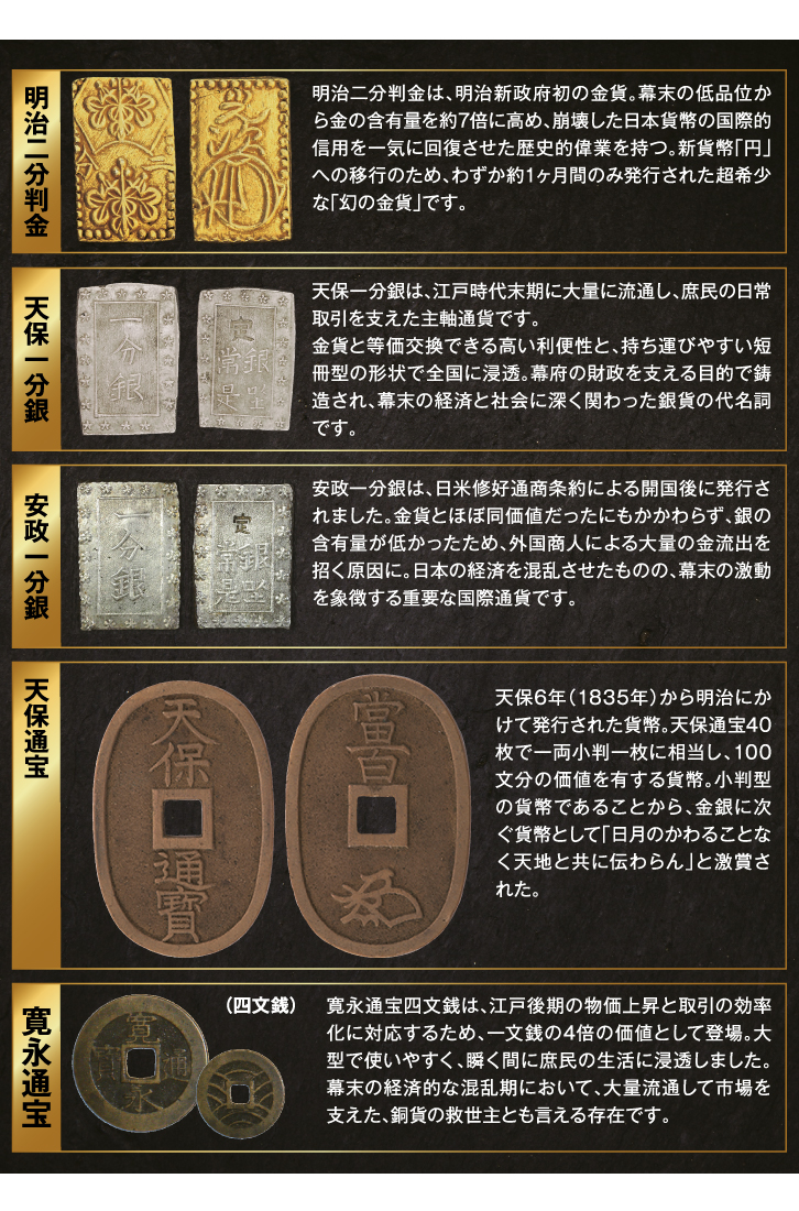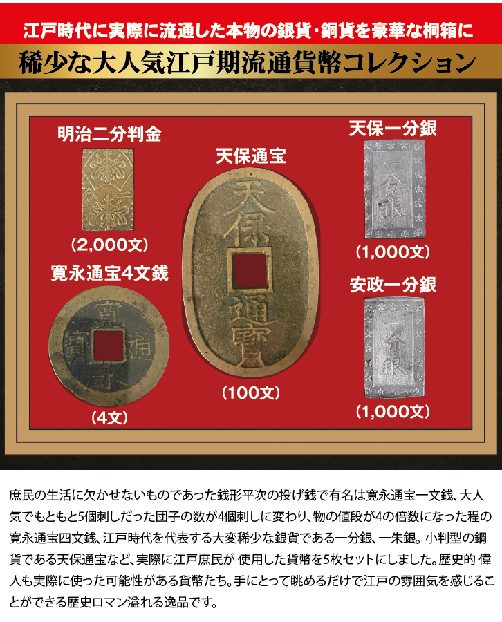 江戸時代に実際に流通した本物の銀貨・銅貨を豪華な桐箱に 稀少な大人気江戸期流通貨幣コレクション 庶民の生活に欠かせないものであった銭形平次の投げ銭で有名は寛永通宝一文銭、大人気でもともと5個刺しだった団子の数が4個刺しに変わり、物の値段が4の倍数になった程の寛永通宝四文銭、江戸時代を代表する大変稀少な銀貨である一分銀、一朱銀。 小判型の鋼貨である天保通宝など、実際に江戸庶民が 使用した貨幣を5枚セットにしました。歴史的 偉人も実際に使った可能性がある貨幣たち。手にとって眺めるだけで江戸の雰囲気を感じることができる歴史ロマン溢れる逸品です。 明治二分判金 明治二分判金は、明治新政府初の金貨。幕末の低品位から金の含有量を約7倍に高め、崩壊した日本貨幣の国際的信用を一気に回復させた歴史的偉業を持つ。新貨幣「円」への移行のため、わずか約1ヶ月間のみ発行された超希少な「幻の金貨」です。 天保一分銀 天保一分銀は、江戸時代末期に大量に流通し、庶民の日常取引を支えた主軸通貨です。 金貨と等価交換できる高い利便性と、持ち運びやすい短冊型の形状で全国に浸透。幕府の財政を支える目的で鋳造され、幕末の経済と社会に深く関わった銀貨の代名詞です。 安政一分銀 安政一分銀は、日米修好通商条約による開国後に発行されました。金貨とほぼ同価値だったにもかかわらず、銀の含有量が低かったため、外国商人による大量の金流出を招く原因に。日本の経済を混乱させたものの、幕末の激動を象徴する重要な国際通貨です。 天保通宝 天保6年(1835年)から明治にかけて発行された貨幣。天保通宝40枚で一両小判一枚に相当し、100文分の価値を有する貨幣。小判型の貨幣であることから、金銀に次ぐ貨幣として「日月のかわることなく天地と共に伝わらん」と激賞された。 寛永通宝 寛永通宝四文銭は、江戸後期の物価上昇と取引の効率化に対応するため、一文銭の4倍の価値として登場。大型で使いやすく、瞬く間に庶民の生活に浸透しました。幕末の経済的な混乱期において、大量流通して市場を支えた、銅貨の救世主とも言える存在です。 専用桐箱に収納 |