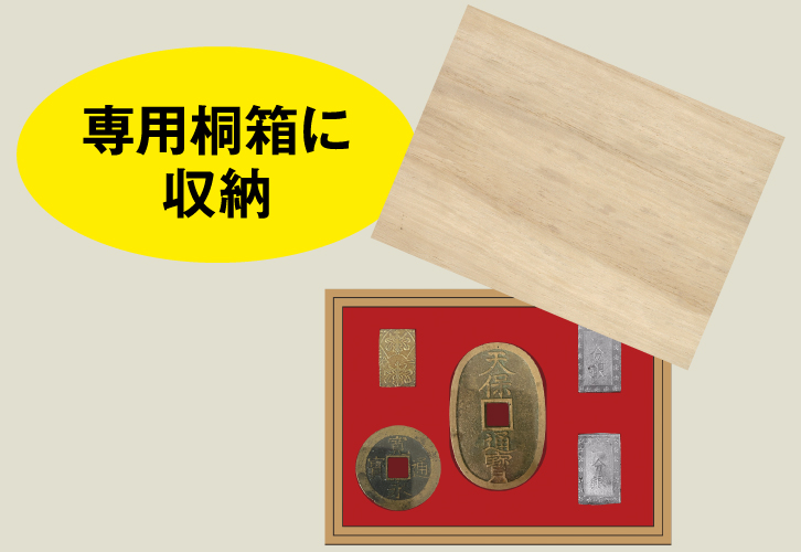 ● セット内容:明治二分判金・天保一分銀・安政一分銀・天保通宝・寛永通宝四文銭 ● 桐箱 ※ 貨幣はアンティークのためキズや汚れがある場合がございます。 |