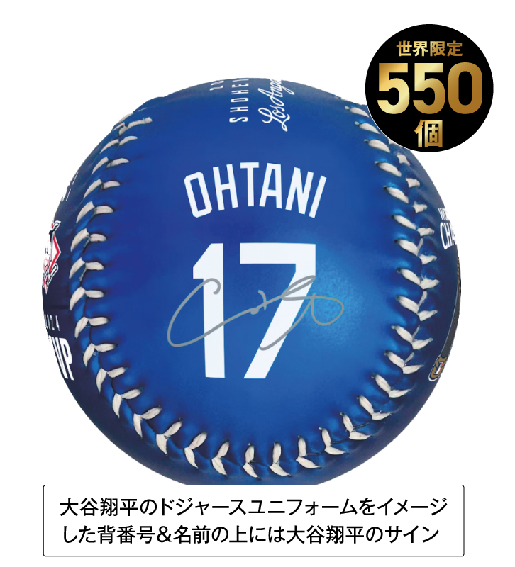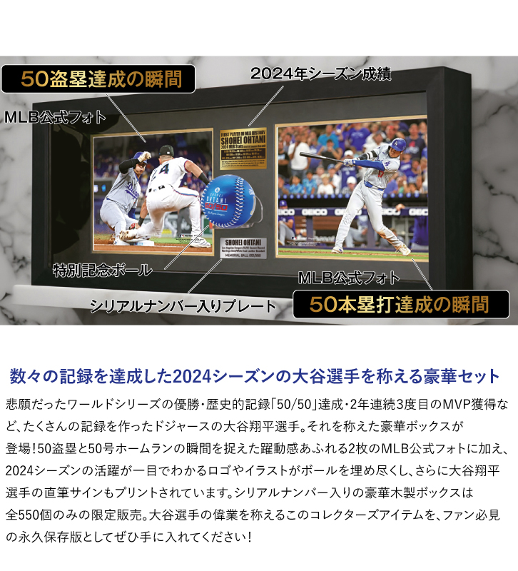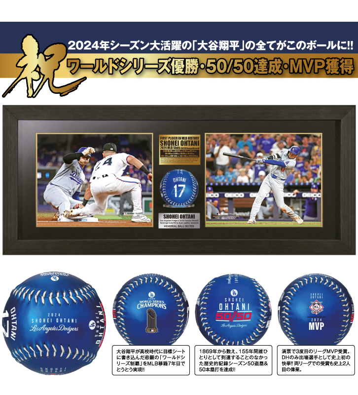 2024年シーズン大活躍の「大谷翔平」の全てがこのボールに!! ワールドシリーズ優勝・50/50達成・MVP獲得 数々の記録を達成した2024シーズンの大谷選手を称える豪華セット 悲願だったワールドシリーズの優勝・歴史的記録「50/50」達成・2年連続3度目のMVP獲得など、たくさんの記録を作ったドジャースの大谷翔平選手。 それを称えた豪華ボックスが登場!50盗塁と50号ホームランの瞬間を捉えた躍動感あふれる2枚のMLB公式フォトに加え、2024シーズンの活躍が一目でわかるロゴやイラストがボールを埋め尽くし、さらに大谷翔平選手の直筆サインもプリントされています。 シリアルナンバー入りの豪華木製ボックスは全550個のみの限定販売。大谷選手の偉業を称えるこのコレクターズアイテムを、ファン必見の永久保存版としてぜひ手に入れてください! 大谷翔平のドジャースユニフォームをイメージした背番号&名前の上には大谷翔平のサイン 2024シーズンの全てが詰まった豪華セット |